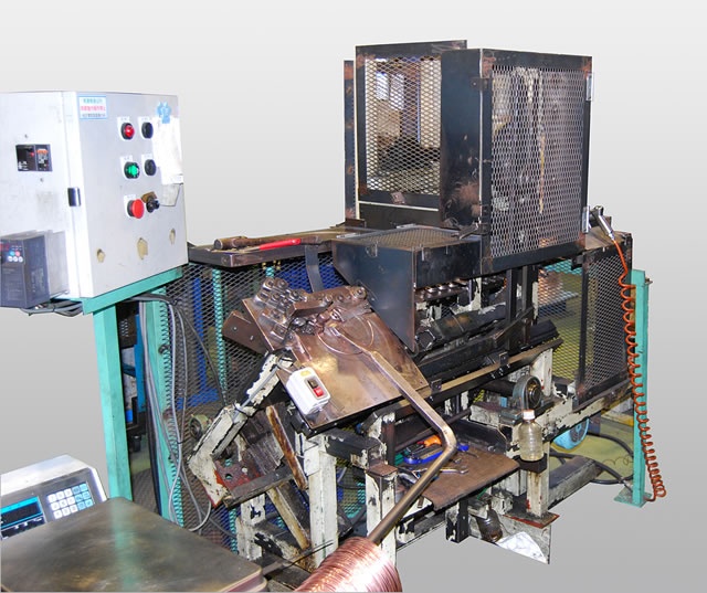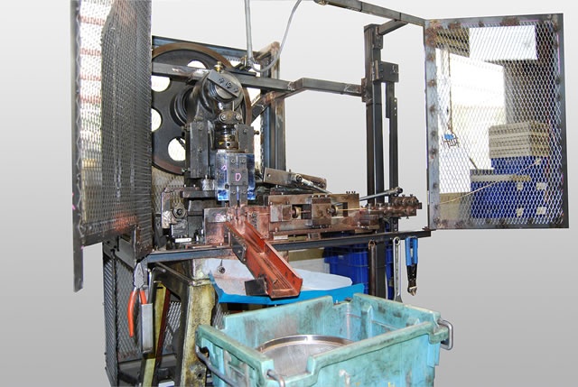 エキセンプレスの動力を軸に伝達し、回転するカムにより揺動運動に変換されることで線材供給部が水平方向に動作し、一定量線材を送ります。エキセンプレスの上下運動を利用し、専用型により銅線を切断、U型形状に曲げ加工します。