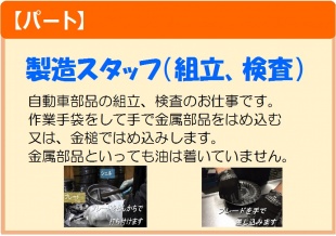 【自動車部品の組立】フルタイム、パート(アルバイト)の製造スタッフ募集中!