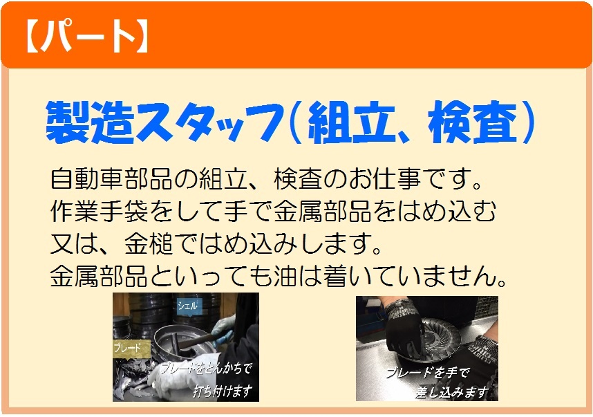 自動車部品の簡単な作業です。初めての方でも大歓迎!